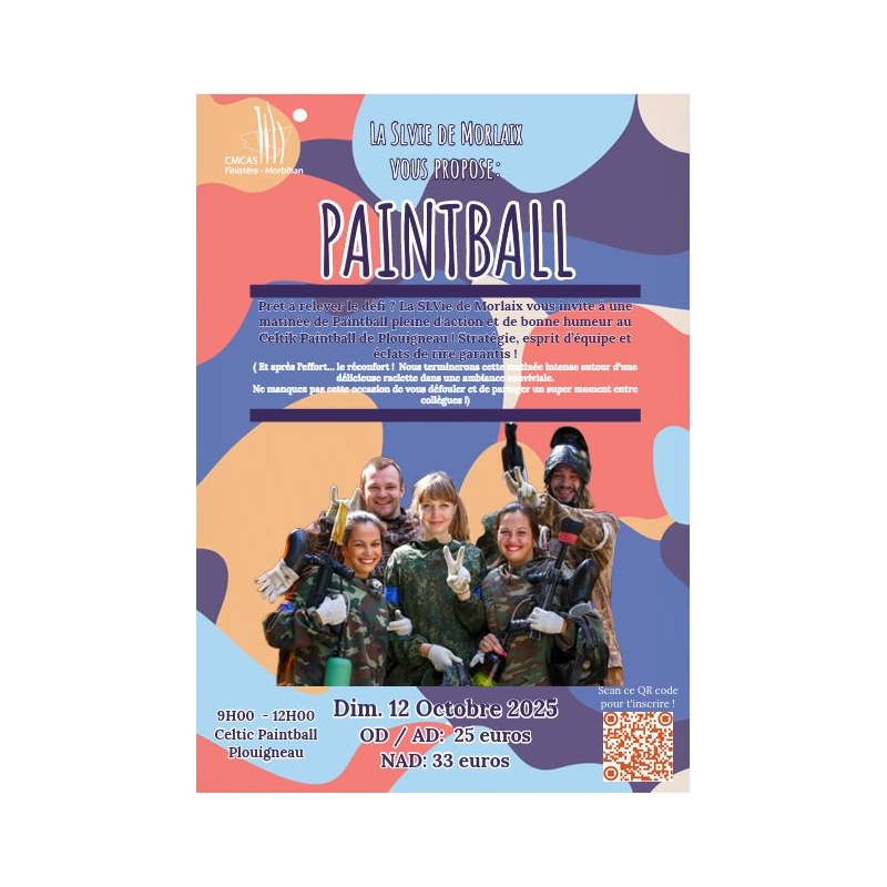 Prêt à relever le défi ? La SLVie de Morlaix vous invite à une matinée de Paintball pleine d’action et de bonne humeur au Celtik Paintball de Plouigneau ! Stratégie, esprit d’équipe et éclats de rire garantis !